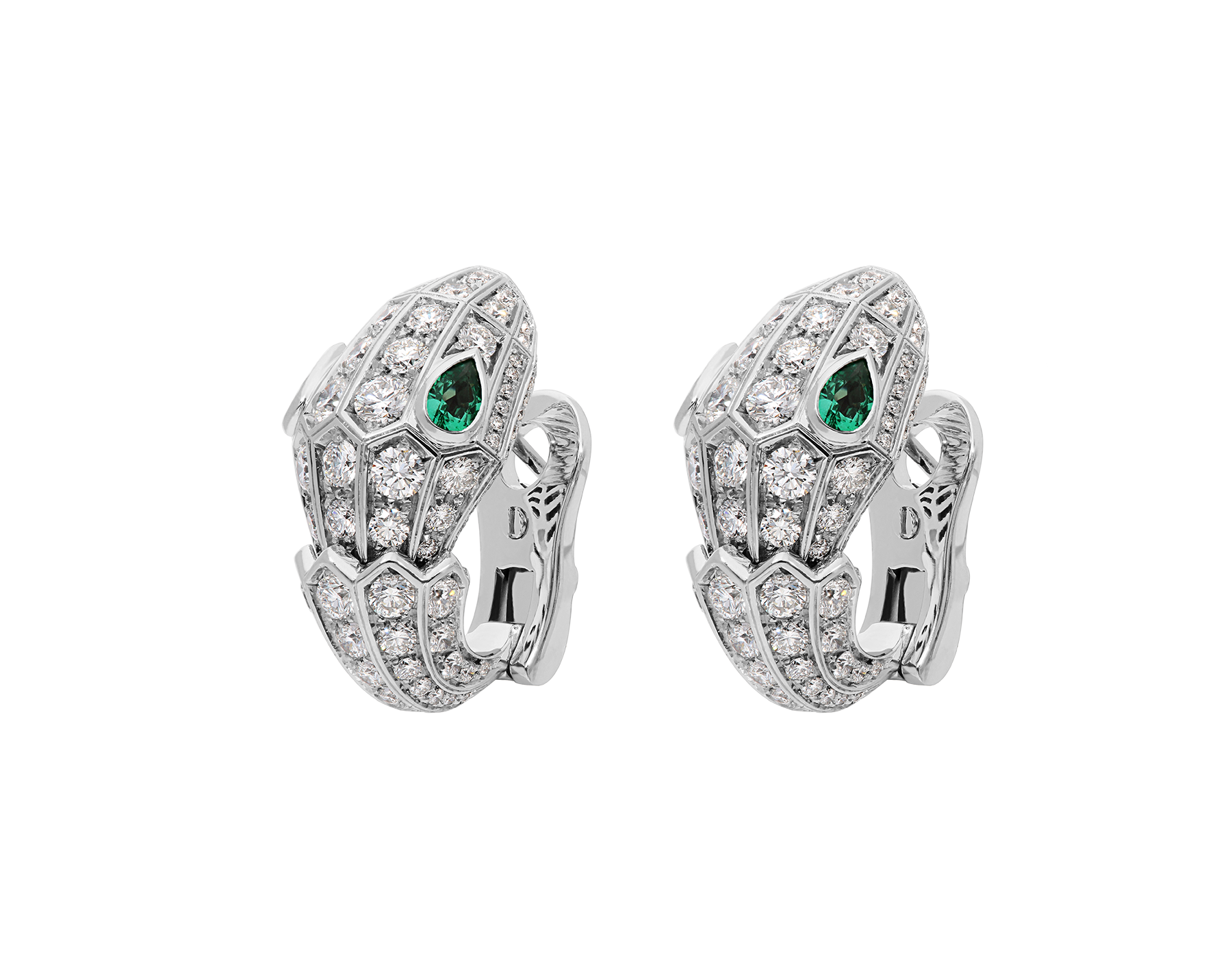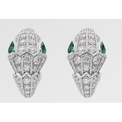 Serpenti系列耳环,白色18K金材质,镶嵌祖母绿蛇眼和全密镶钻石