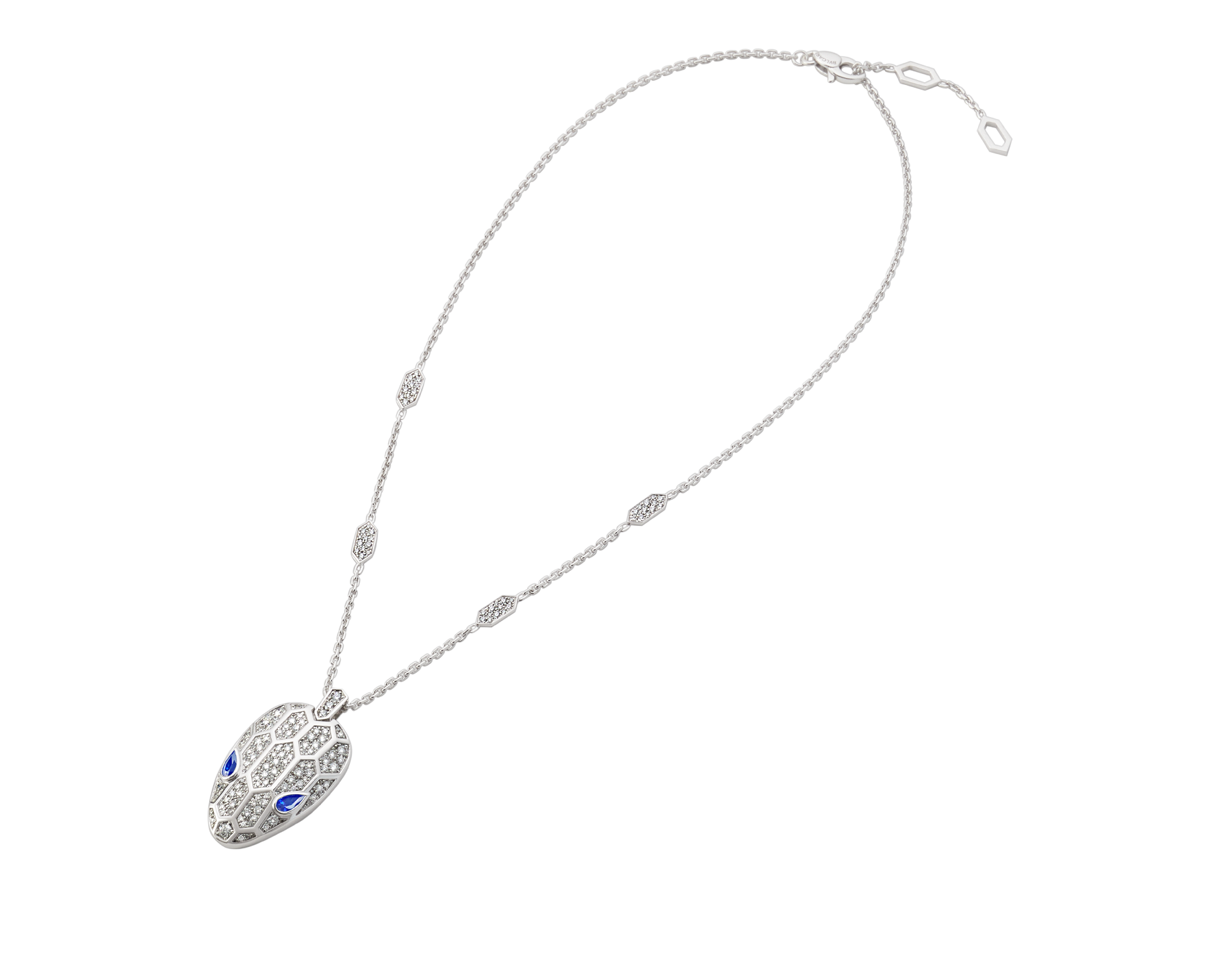Serpenti系列吊坠项链,白色18K金材质,点缀蓝色蓝宝石双眸,链身和蛇首饰以密镶钻石